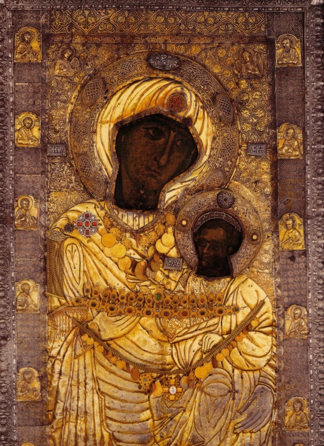 Икона, хранившаяся несколько поколений у благочестивых людей, в годы иконоборчества (9 век) стала предметом преследования. Воин пронзил копьём образ и из него излилась кровь. В наше время чудотворная икона хранится на Афоне, а множественным спискам с неё молятся тысячи верующих. К ней обращаются за помощью в болезнях и бедах, молят об избавлении от грехов, о плодородии, защите.