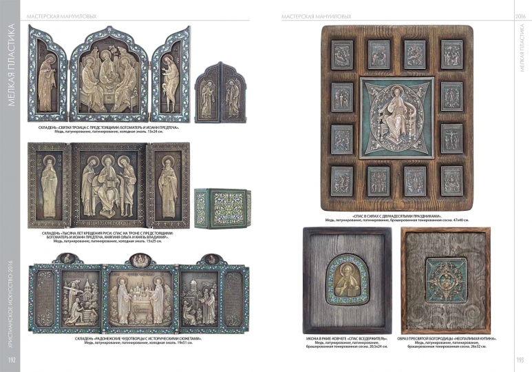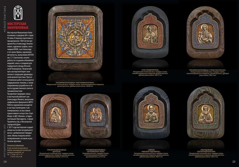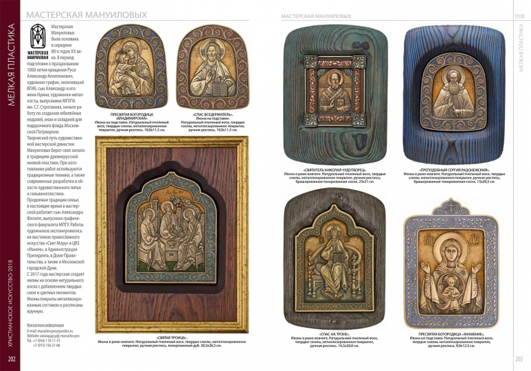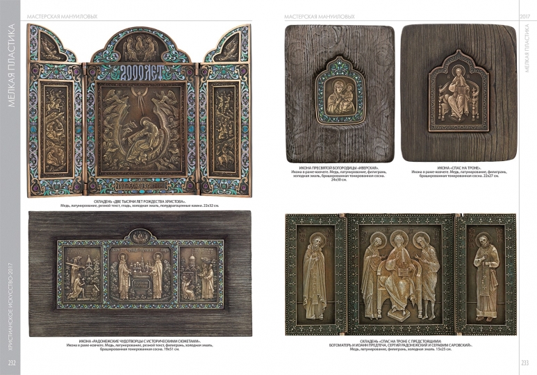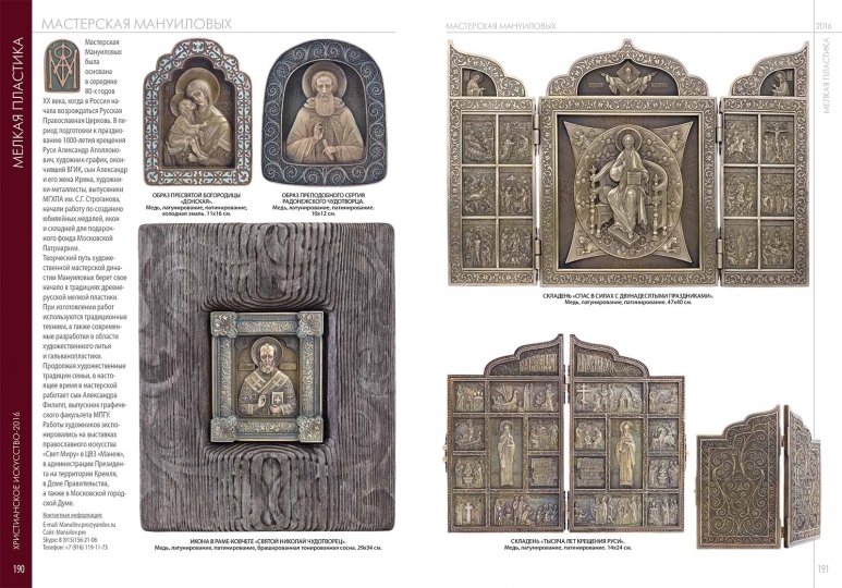 Изделия семейной мастерской Мануиловых хорошо известны знатокам и ценителям русского церковного искусства. За тридцать лет работы художники создали впечатляющую коллекцию рельефных изображений на религиозные темы, образов Спасителя, Богороматери, библейских и местночтимых святых. Изготовленные по уникальной технологии медные иконы и другие культовые изделия из металла заняли отдельное место в подарочном фонде Патриарха и коллекциях высших иерархов Русской Православной Церкви — наместника Свято-Троицкой Сергиевой Лавры архиепископа Феогноста, наместника Ново-Спасского монастыря архиепископа Алексия, бывшего наместника Свято-Данилова монастыря Архиепископа Евлогия, бывшего председателя отдела внешних церковных связей Митрополита Филарета, Викария Московской епархии, епископа Красногорского Саввы, бывшего председателя хозяйственного управления Московской Патриархии метрополита Мефодия. Один из складней, изготовленных к 1000-летию Крещения Руси, предназначался для подарка от Патриарха Пимена президенту США Рональду Рейгану. Некоторые работы, — в частности складень «2000-летие Рождества Христова», — переданы в дар Патриарху Алексию II. В 2007 г складень «Спас в Силах с праздниками» был подарен Папе Римскому Бенедикту XVI к его 80-летию. Произведения были приобретены подарочным фондом Президента России, российскими и зарубежными коллекционерами и меценатами. Работы Мануиловых экспонировались на выставках и ежегодных ярмарках православного искусства в Выставочном центре «Манеж», в Администрации Президента России, в Доме Правительства на Краснопресненской набережной, в Московской городской Думе